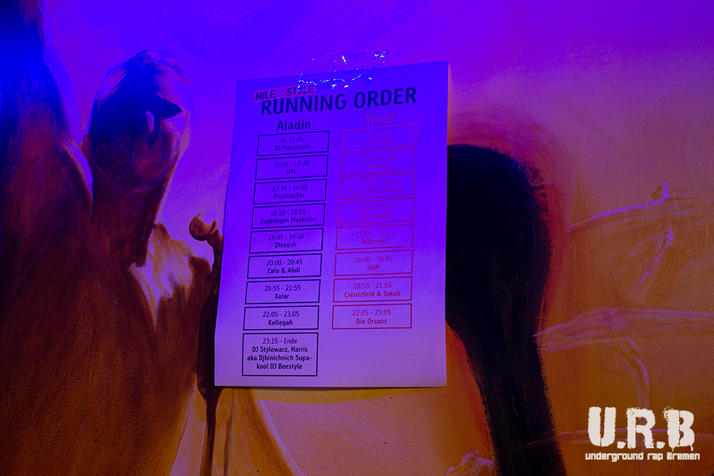 Das Mile of Style Festival ist, das größte deutsche Indoor-Rapfestival. Das in Aurich gestartete Festival fand im Jahr 2013 zum siebten mal statt. Man hat das ruhige Ostfriesland verlassen und verlagert das ganze nach Bremen, genauer gesagt in die Alladin Music Hall. Zwei große Festivalbühnen wird es geben, über 50 Artists. Und nun ist auch das (fast) komplette LineUp veröffentlicht worden. Nur ein Secret Co-Headliner ist noch offen. Aber das jetzige Line-Up kann sich sehen lassen. Leute wie Haftbefehl, Xatar, Celo & Abdi, Die Orsons, Kollegah, Azad und Prinz Porno werden an Ostern in Bremen die Stage rocken.